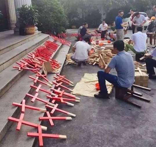 | Christians in Wenzhou, Zhejiang, build and paint crosses to distribute in protest to the province-wide demolition campaign.