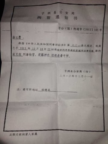 According to Article 61 of the Constitution of People’s Republic of China, our review has put Feng Tiandong into criminal detention at 10 o’clock on Dec. 10, 2013 for his crime of organizing and using an evil cult organization to obstruct the law.