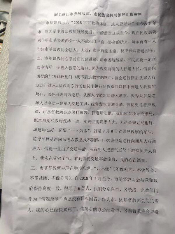 1. To date, the “2018 Religious Group License and Legal Person Registration” of the Municipal CCC & TSPM [Editor’s note: “CCC & TSPM” refers to the China Christian Council and the Three-Self Patriotic Movement, China’s two state-run Christian organizations] has not been renewed. The chief reason is because of the turnover of leaders who oversee the religion bureau, resulting in no seal on the application. Currently, the civil affairs bureau requires an annual examination. As one person in the CCC & TSPM can’t solely serve as the legal representative of the CCC & TSPM, we requested that an additional person be designated as the legal agent of the CCC, namely the candidate: the vice president of the Municipal TSPM and the secretary-general, Yan Jianxin.