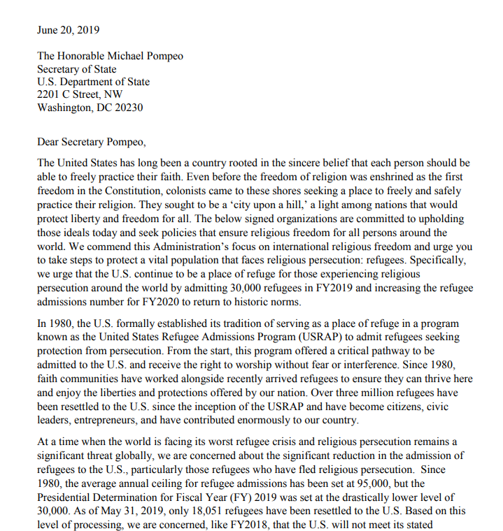 (Washington D.C. – June 20, 2019) China Aid is one of 42 signatories on a letter addressed to U.S. Secretary of State Mike Pompeo asking the government to strengthen refugee resettlement for those experiencing religious persecution.