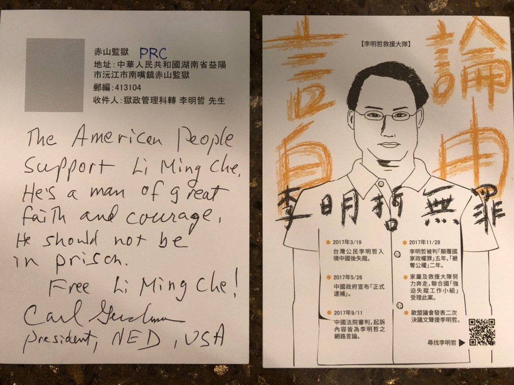 | A note from NED President Carl Gershman to Taiwanese prisoner Li Mingche. (Photo: ChinaAid) |