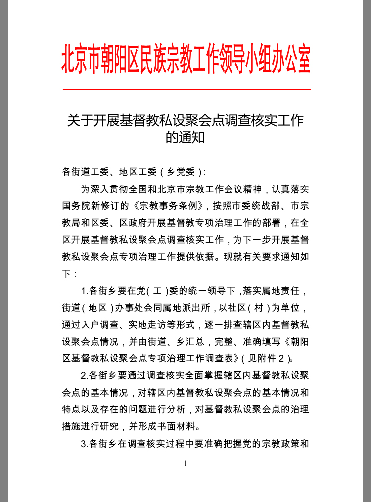 Such crackdowns are not limited to Henan, however. In Beijing’s Chaoyang District, a government ethnic and religious affairs group, published the “Notice of Launching an Investigation of Private Christian Gathering Places.” The notice demands that all government-related street work and district committees and their subordinates to carry out the Religious Affairs Regulations and arrange specialized initiatives in various government departments in preparation to manage house churches. It also orders that the street and township committees should partner under the leadership of the Party to assign regional tasks and visit house churches. Then, the churches should fill out the “Questionnaire on the Specialized Management of Private Christian Gathering Places in Chaoyang District,” allowing the local government to analyze the characteristics of the churches, identify alleged problems, and come up with measures accordingly. Local officials are then asked to submit their findings before 4 p.m. on March 30.