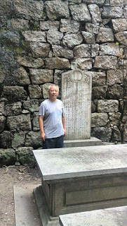 | Elder Zhang in front of a missionary’s tombstone. (Photo: Facebook) |