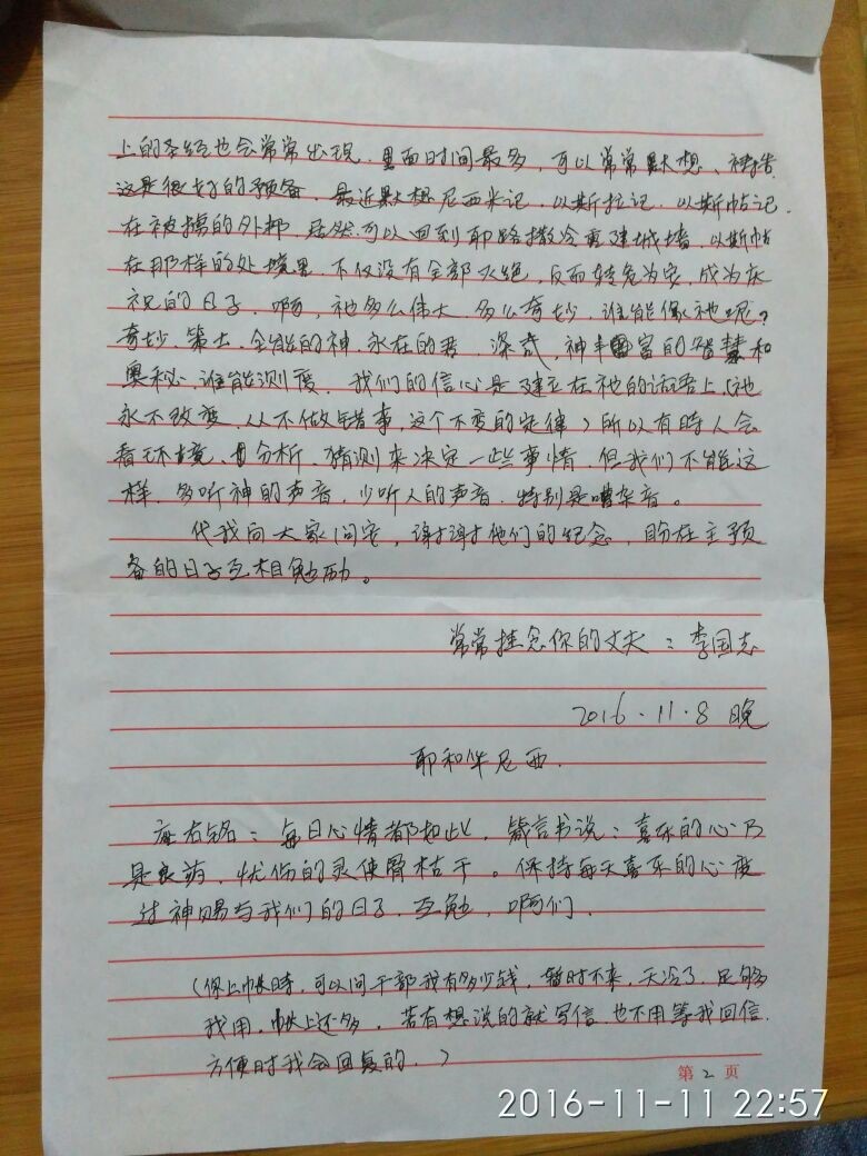(Guiyang, Guizhou—Nov. 16, 2016) A house church pastor incarcerated in China’s central Guizhou province on a falsified “divulging state secrets” charge wrote a letter to his wife on Nov. 8, updating her on his condition.