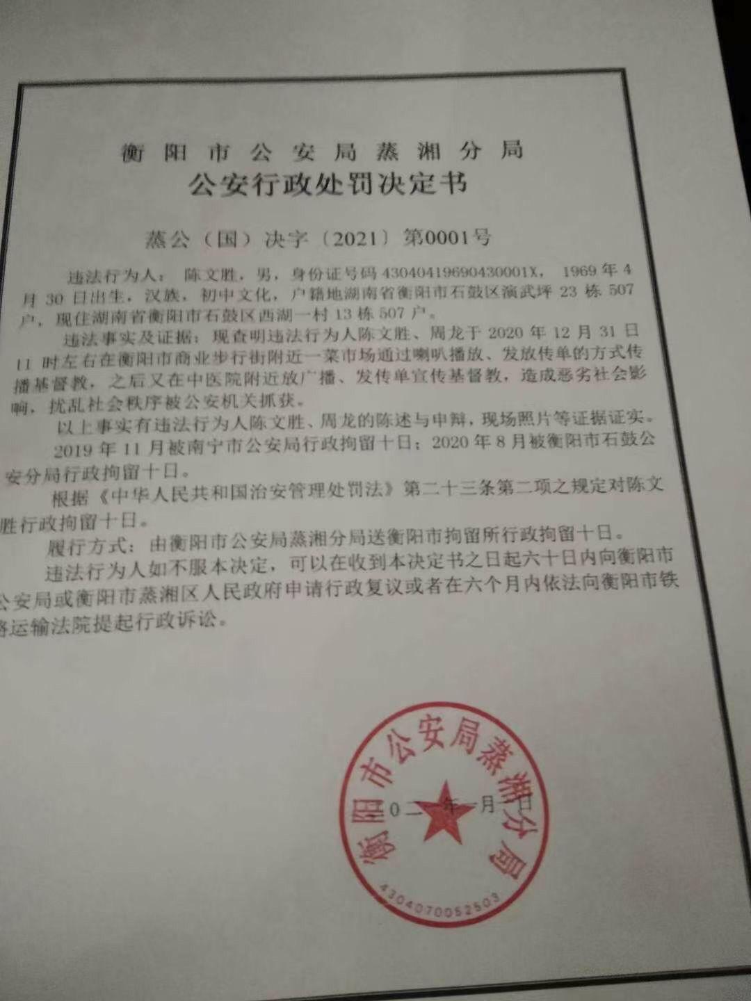 (Hengyang, Hunan, Province—Jan. 03, 2021) On January 01, New Year’s Day, the Chinese Communist Party (CCP) Zhengxiang Branch of Hengyang Municipal Police Department issued its first 2021 penalty—to again detain Chen Wensheng for 10 days for preaching the gospel. CCP authorities plan to hold Preacher Chen, a Christian resident of Hengyang they know as a street preacher, in custody at Hunan Hengyang Detention Center until January 10.