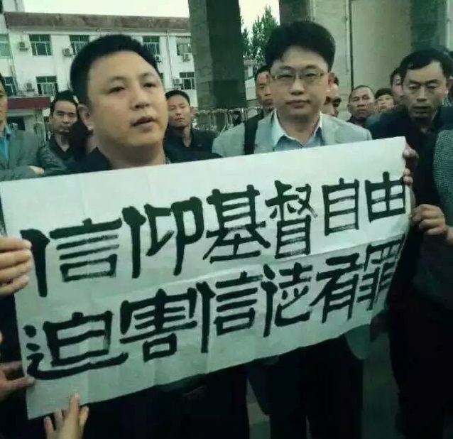 | Lawyer Chen Jiangang holds a banner outside the court, reading “Believing in Christ is our freedom; persecuting Christians is a crime.” (Photo: China Aid) |
