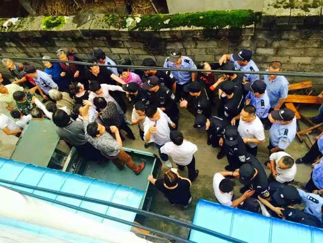 | Pingyuan Church members stood against Lishui police when officials came to remove the church’s cross on May 9, 2015. (Photo: China Aid) |