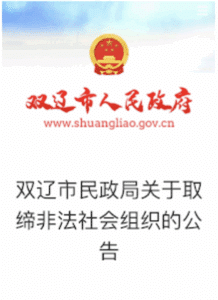 On June 24, the Shuangliao City Civil Affairs Bureau issued a notice stating that “Zion Church” had not registered with the relevant authorities in charge and had unlawfully carried out activities in the name of a social organization, thus constituting an illegal social organization. The notice specified that the decision was made in accordance with Article 32 of the Regulations on the Registration and Administration of Social Organizations and Article 3 of the Measures for the Banning of Illegal Social Organizations.