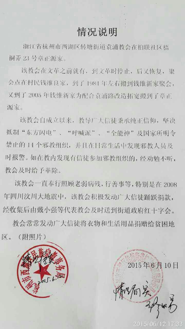 | The Xihu District Ethnic and Religious Affairs Bureau of Hangzhou stamped a fact sheet confirming that Dai Xiaoqiang and Yuanpu Church are not involved with cults.